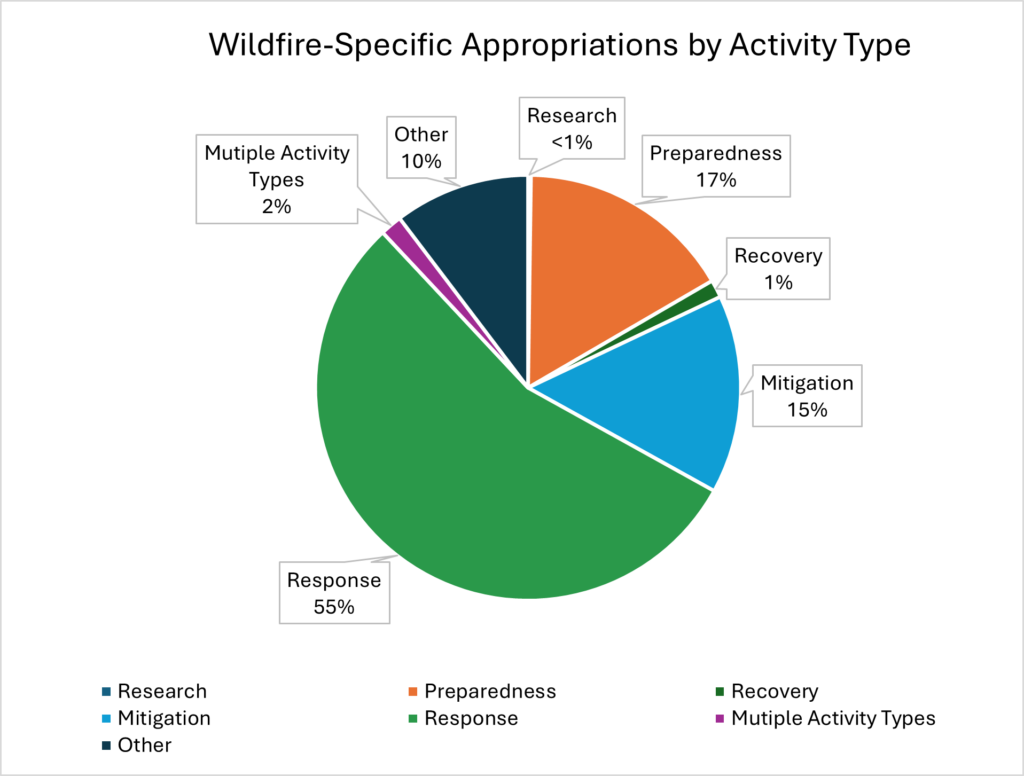 Risk mitigation activities have consistently been recognized as critical for reducing federal wildfire costs, yet they have not received the necessary investments to safeguard against rising future expenses. Mitigation activities account for 17 percent of the wildfire-specific appropriations catalogued here. However, as noted, while appropriations for mitigation activities are intended to reduce the risk or impacts of wildfires, it remains unclear to what extent these funds directly contribute to effective mitigation. Programs and line items funded under hazardous fuels reduction need to be closely scrutinized and carefully evaluated using outcome-oriented metrics. Furthermore, programs created to address the lack of commercial viability in forest and wood products may create perverse incentives that undercut forest health objectives, potentially increasing wildfire risk.